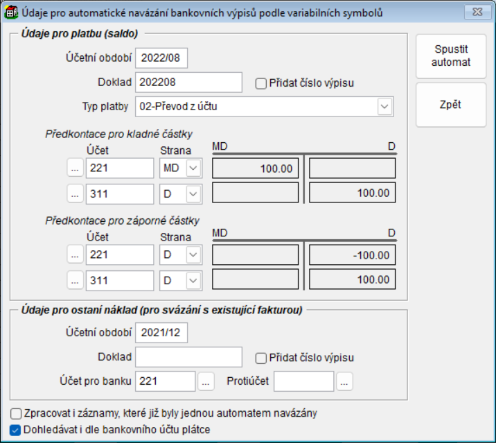 - Tlačítko Automat - párovaní záznamů s variabilní symbol a číslo účtu.