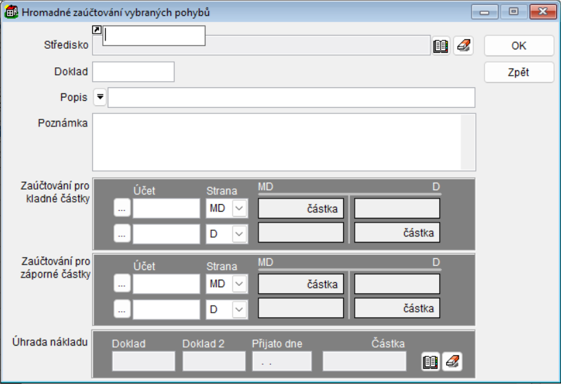 - Tlačítko Hromadné zaúčtování - pro ostatní pohyby (úroky, poplatky, atd.)