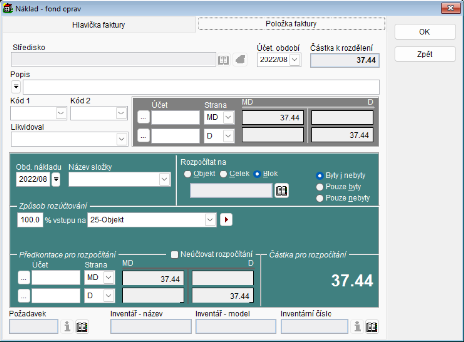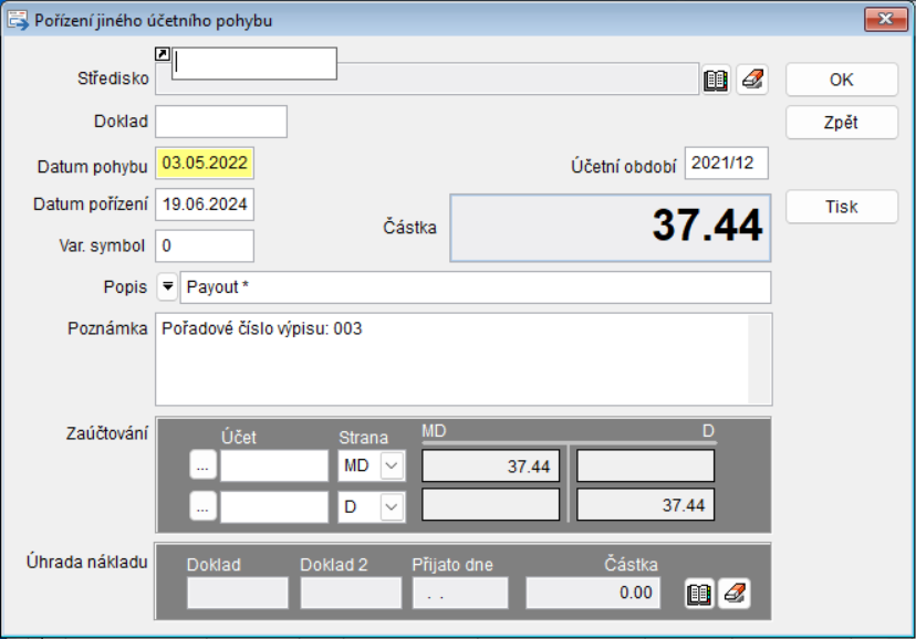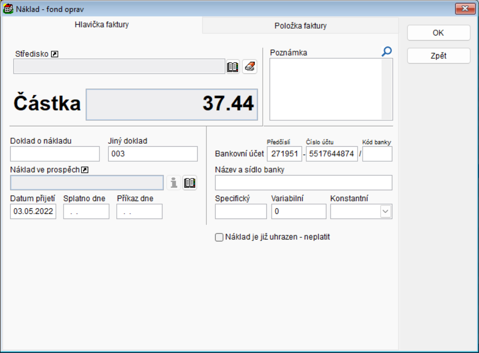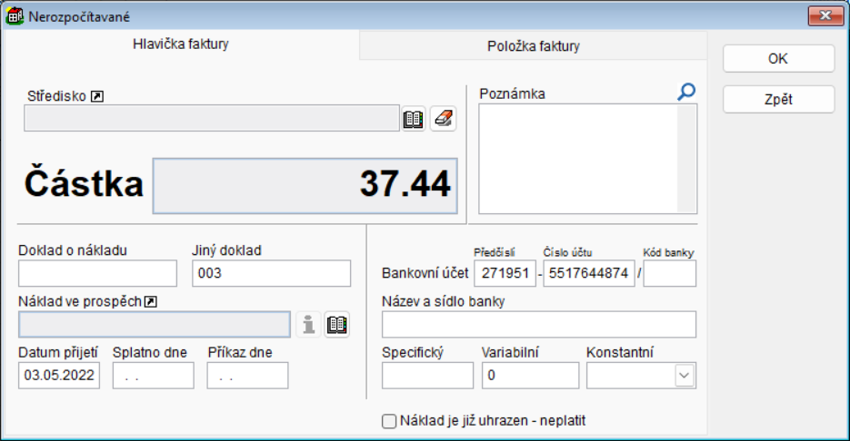 - Tlačítko Náklad - když není zadána faktura