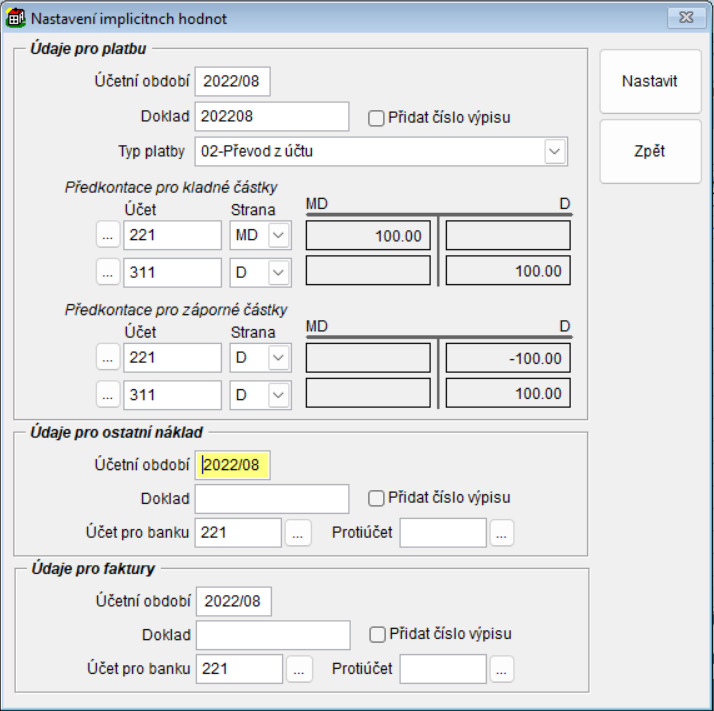 - Tlačítko Nastavit - hromadné základní přednastavení záznamů. (Doklad, typ platby, analytyka)