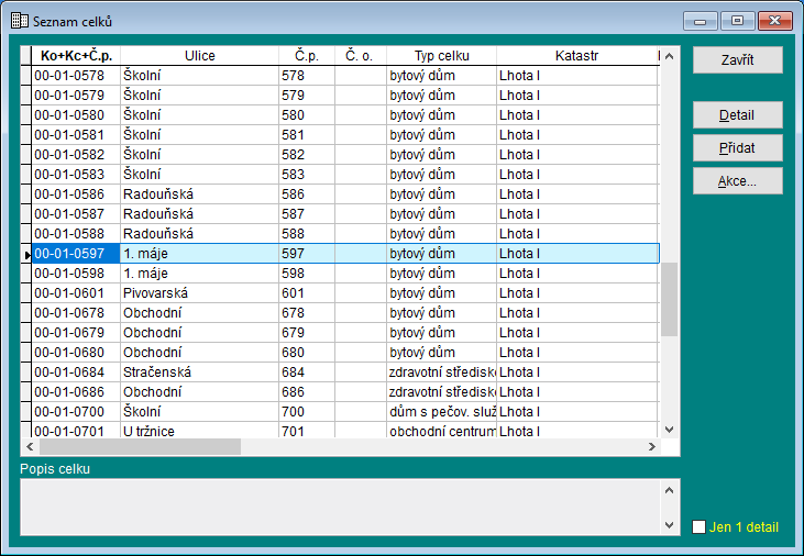 Úloha Celky umožňuje vést evidenci domů, bloků garáží, zahrádkářské kolonie, garážových stání apod. Po jejím spuštění se objeví okno typu seznam, obsahující záznamy o všech celcích, které již máte v evidenci pořízeny. Kromě běžných tlačítek Zavřít, Detail a Přidat je na formuláři i tlačítko Akce, umožňující spuštění několika dalších úloh. Je třeba si uvědomit, že pro zavedení nějakých objektů (byty, nebytové prostory atd.), musí být nejprve pořízen celek, v němž se příslušné objekty nacházejí. K tomu, aby bylo možné pořídit celek (dům), je nutné mít definován číselník obcí a částí obce. Poté je již možno pořídit celek. Jako identifikační klíč celku je použito číslo popisné spolu s kódem obce a části obce, v níž se celek nachází. Pro použití čísla popisného v identifikačním klíči se číslo popisné automaticky doplňuje zleva nulami a zprava mezerou. Více o pravidlech stavby klíče v kapitole Klíč - klíčový údaj