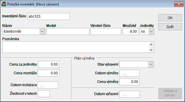 - Stav vybavení - rozbalovací nabídka již použitých hodnot, lze zadat z klávesnice