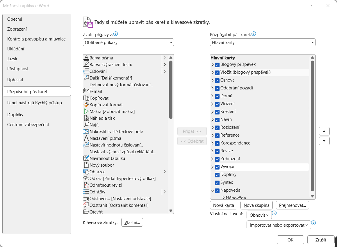 Nyní přijde trochu složitější část. Poté, co jste uložili smlouvu do nového formátu, otevřete ji, a zkontrolujte, že máte povolenou katru Vývojář. Soubor → Možnosti → Přizpůsobit pás karet → Hlavní karty