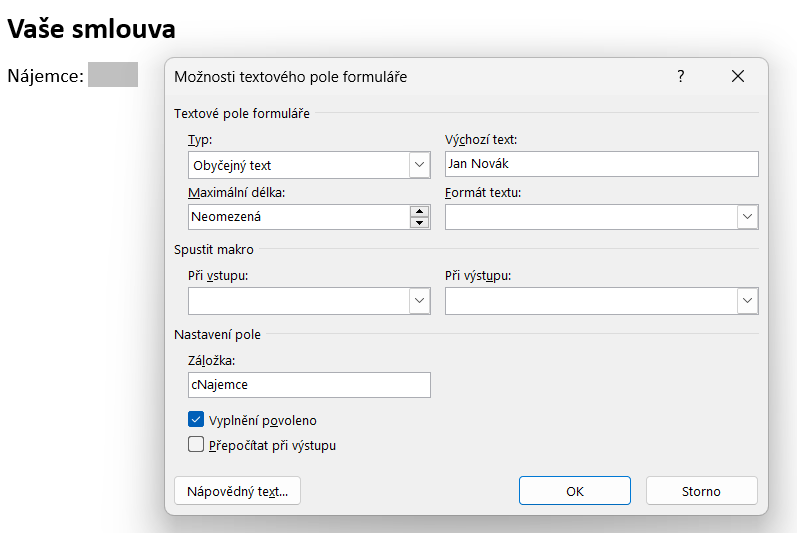 Pro vložení proměnné klikněte na pole pravým tlačítkem myši a zvolte Vlastnosti. Otevře se Možnosti pole. V dolní části je Nastavení pole/Záložka. Tam vložte proměnnou. Aby jste věděli, co se bude přetahovat z programu SSB, doporučujeme vyplnit Výchozí text v horní části Možností pole. Např. pro nájemce si tam můžete dát náhodné jméno a příjmení, které vás zrovna napadne.