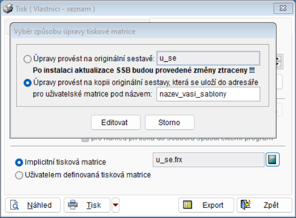 Pokud máte vlastní Nájemní smlouvu nebo Dodatek k nájemní smlouvě v aplikaci Word a chtěli byste ji použít v programu SSB, je potřeba ji pro správné načtení dat z programu upravit. Jako první je důležité vytvořit kopii sestavy v programu SSB. Na záložce Parametry tisku sestavy ve spodní části zkontrolujte zda máte nastavený tisk Implicitní tiskovou matricí. Vedle názvu matrice klikněte na zelený sešit a vyberte spodní volbu Úpravy provést na kopii originální sestavy… Pojmenujte dle libosti.