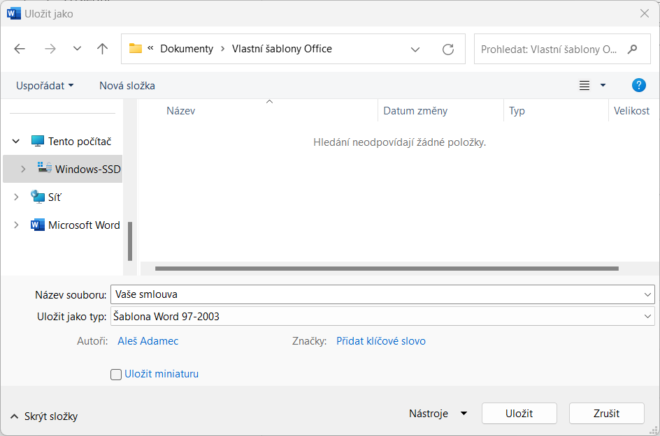 …poté vytvořenou šablonu vložte. Aby jste ji vytvořili ve formátu, který s programem SSB bude komunikovat, uložte volbou Uložit jako… v aplikaci Word váš dokument do formátu .dot, nebo-li Šablona Word 97-03. Můžete klidně rovnou do složky s kopií matrice. Avšak si při ukládání hotové šablony pohlídejte, aby jste šablonu skutečně do tohoto adresáře uložili. Word má tendenci ukládat všechny šablony do složky s šablonami v dokumentech uživatele.