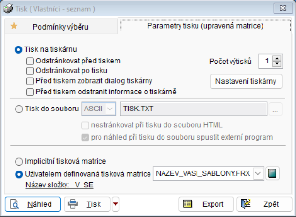 Nyní jen zkontrolujte, že je šablona .dot ve složce vlastní matrice přímo u dané matrice a pro tisk do vaší šablony na Parametrech tisku vyberte možnost Uživatelem definovaná matrice a název vaší matrice (pokud byste jich měli náhodou více).