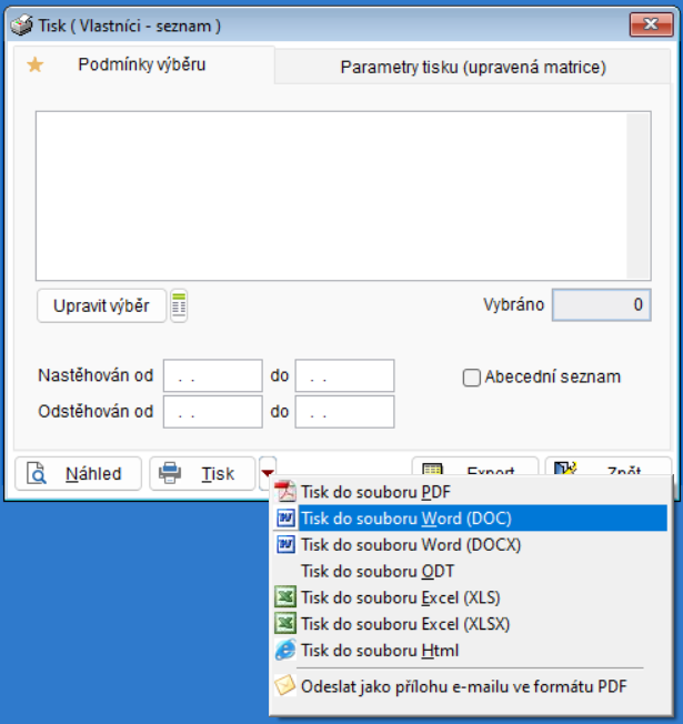 Pro tisk do šablony již zbývá jen zvolit správně tisk, tedy do souboru Word.