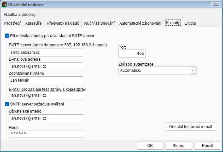 Po vyplnění tlačítkem Odeslat testovací e-mail program odešle e-mail na adresu Od uživatele. Je to pro ověření nastavení. Tento krok doporučujeme.