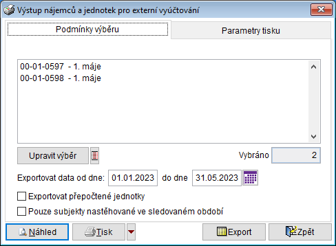 Voláno z menu: Vyúčtování ⇒ Export jednotek pro externí vyúčtování