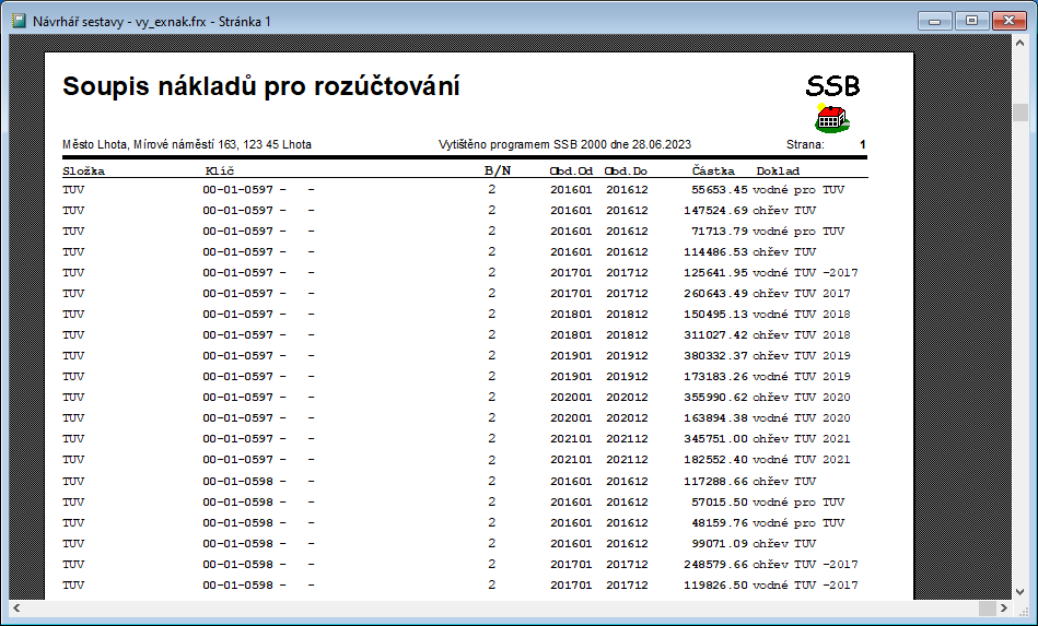 Úloha umožňuje vytisknout či uložit (tlačítko Export) do souboru náklady zadané v úloze Náklady dle libovolného výběru. Tyto náklady lze použít k rozúčtování mimo program SSB2000 a rozúčtované náklady na jednotlivé subjekty zadat do programu v úloze Přímé náklady subjektů. Je třeba zajistit, aby náklady předané k rozúčtování mimo program nebyly při vyúčtování zahrnuty do rozpočítání nákladů v rámci programu SSB2000. To lze zajistit např. označením položek nákladů samostatnou skupinou a tuto skupinu nákladů poté do vyúčtování nezařazovat.