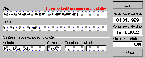 - Údaje Metoda, Sazba a Penále počítat od - do - jsou pro kontrolu zobrazené informace konta (viz. údaj Věřitel, též Formulář Definice konta).