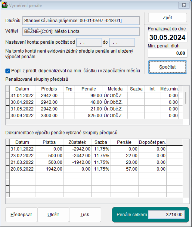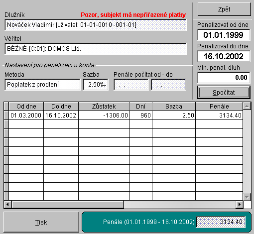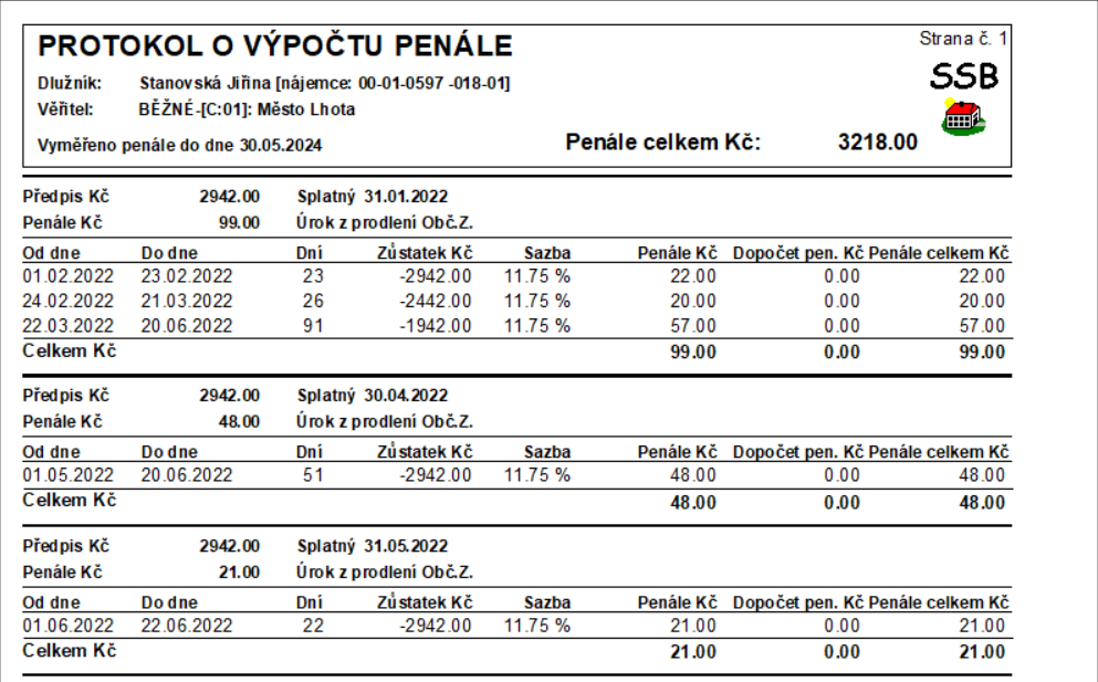 Tabulka obsahuje výpočet penále po jednotlivých časových úsecích. Každý časový úsek obsahuje dlužnou částku, počet dnů, sazbu penále v promile (resp. v procentech) a vyčíslené penále. Tlačítkem Tisk se spustí běžná tisková úloha, která vytiskne zobrazený výpočet penále.