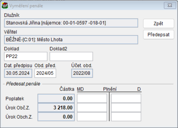- Věřitel - konto včetně subjektu věřitele, vůči kterému je penále vyměřováno.