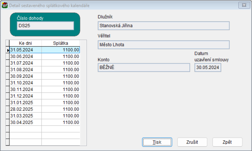 Formulář zajišťuje zadání a evidenci splátkového kalendáře určeného pro splácení dluhu na kontě.