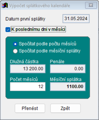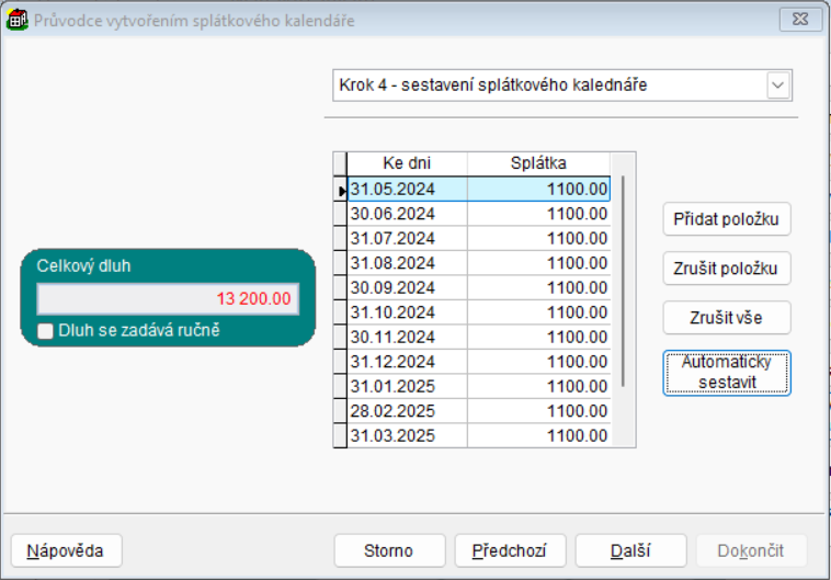 Na tomto formuláři lze automaticky stanovit měsíční splátky danou částkou či na daný počet měsíců a určit datum splatnosti v měsíci. Tlačítko Přenést přenese nastavené splátky do tabulky Průvodce. - Obrázek: Průvodce vytvořením splátkového kalendáře (Krok 5 - dokončení)
