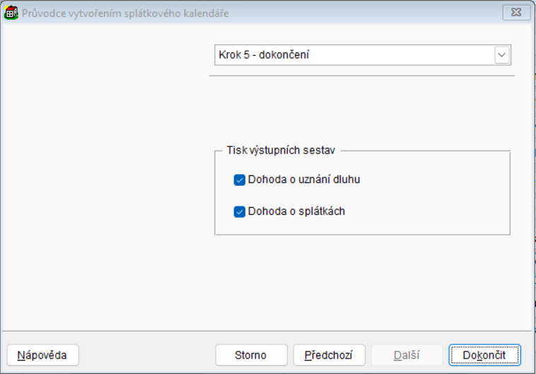 V tomto pátém a posledním kroku je možno (zapnutím předvolby Dohoda o uznání dluhu či Dohoda o splátkách) vytisknout příslušné dokumenty. Po stisknutí tlačítka Dokončit jsou spuštěny standardtní tiskové úlohy pro tisk předvolených dohod, splátkový kalendář je uložen a průvodce je ukončen. Vzory tiskových sestav je možno vidět v Příklad tiskové sestavy "Dohoda o uznání dluhu"