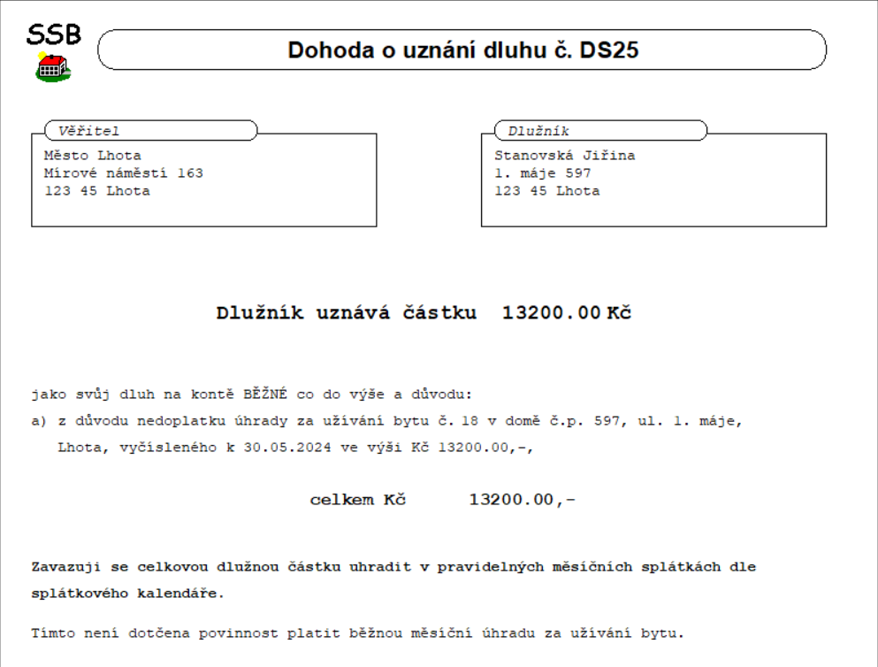 - Číslo dohody, tabulka splátek, Dlužník, Věřitel, Konto a Datum uzavření smlouvy - údaje identifikující splátkový kalendář a případnou dohodu o splátkách. Údaje jsou pouze ke čtení. Případné změny je třeba řešit zrušením stávajícího splátkového kalendáře a vytvořením nového.