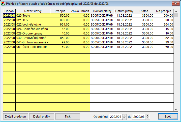 kde tlačítko Detail předpisu spouští Formulář Předpis a tlačítko Detail platby spouští Formulář Platba - Tlačítko Rozbalit vše - rozbalí všechny řádky do jednotlivých položek (žluté řádky).
