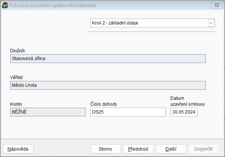 - Tlačítko Splátkový kalendář - v případě, že splátkový kalendář neexistuje, spouští Průvodce vytvořením splátkového kalendáře. V případě již vytvořeného splátkového kalendáře spouští Formulář Detail sestaveného splátkového kalendáře.