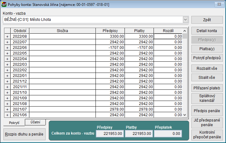 - Tabulka obsahuje předpisy vybraného konta a vztahu a jim přiřazené platby kumulované do řádků po obdobích předpisu. Poklepáním myší na znaménko „+“ lze řádek rozbalit do jednotlivých složek předpisu. Záložka Pokrytí zobrazuje předpisy a jejich pokrytí (zaplacení) přiřazením plateb. Záložka Účetní zobrazuje účetní pohled na pohyby konta.