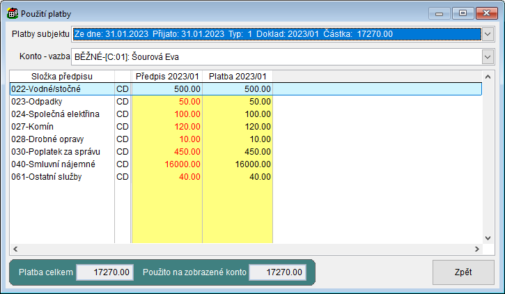 • Platby subjektu - rozbalovací nabídka všech plateb subjektu. Vybraná platba je rozepsána v tabulce níže.