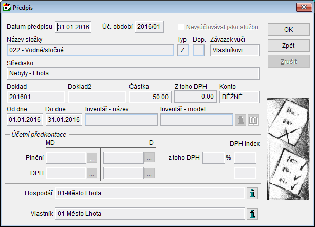 - Předvolba Položka se nebude vyúčtovávat jako služba - lze označit předpis zálohové složky, která standartně podléhá vyúčtování. Vyúčtování takto označenou složku nebude brát v potaz.