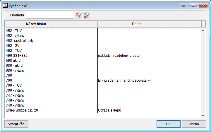 - Tabulka obsahuje po spuštění úplný seznam definovaných bloků. Některé bloky lze označit.