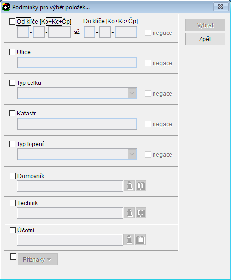 - Tlačítko Filtr spouští Obrázek: Formulář Podmínky pro výběr položek (celků)