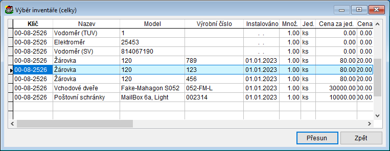 • Tlačítko Přesun předá odkaz na právě vybraný zařizovací předmět do volající úlohy.