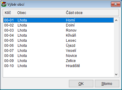 - Tabulka obsahuje po spuštění úplný seznam obcí a jejich částí. Některé záznamy lze označit.