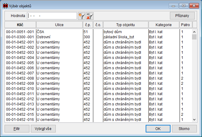Ten umožňuje zobrazenou nabídku zúžit na objekty splňující zadané podmínky. Způsob práce s filtry včetně příkladů je popsán v kapitole Výběrové mechanismy. - Tlačítko Vybrat vše označí všechny položky výběru.