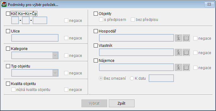 - Tlačítko Filtr spouští Obrázek: Formulář Podmínky pro výběr položek (objektů)