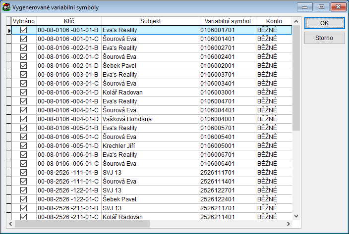 - Podle klíče - generuje 10-timístný číselný variabilní symbol složený z prvních čtyř znaků CP, dále CB (nečíselné znaky budou nahrazeny „0“) a dále z prvního nalezeného volného pořadového čísla začínajícího u nájemců 001, u vlastníků 401 a hospodářů 701.