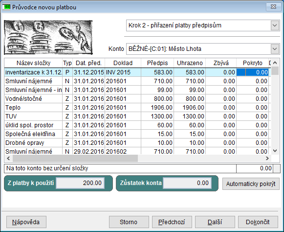 Automaticky pokrýt. Další možností je zapsat přiřazení přímo do jetnotlivých řádků tabulky. Jinou možností je přenesení částky pravým tlačítkem myši z tohoto údaje (kursor se změní na zelené bankovky) na libovolný řádek tabulky - Zůstatek konta - zobrazuje aktuální zůstatek konta. Mění se spolu s přiřazováním platby.