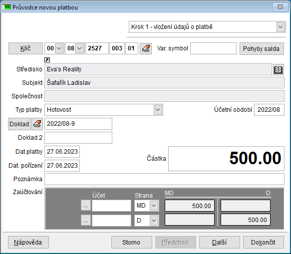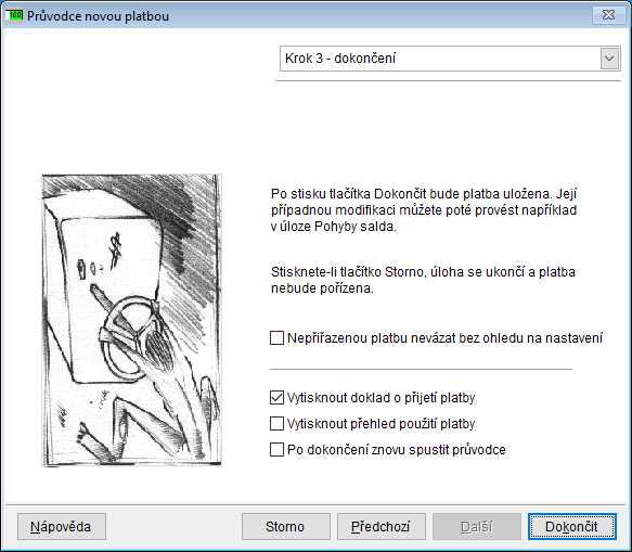 Úloha spouští Průvodce novou platbou. S každou platbou je třeba provést několik úkonů, které se hromadně provádějí v měsíční uzávěrce. Tento průvodce umožňuje tyto kroky provést okamžitě individuálně s každou platbou.