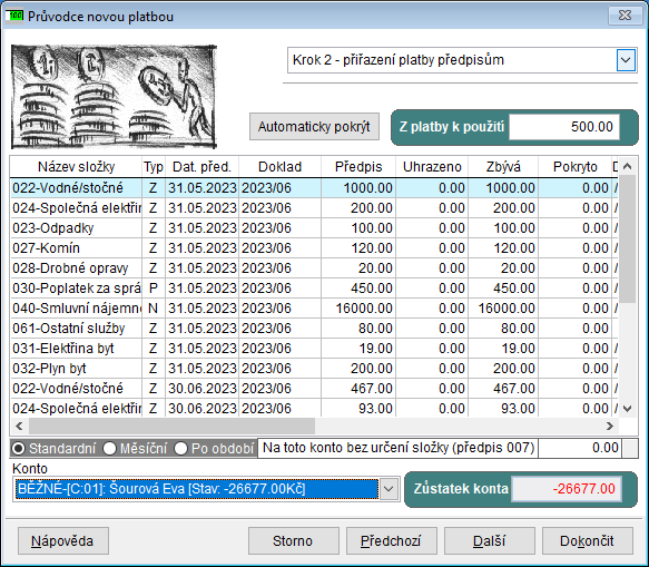 Automaticky pokrýt. Další možností je zapsat přiřazení přímo do jetnotlivých řádků tabulky. Jinou možností je přenesení částky pravým tlačítkem myši z tohoto údaje (kursor se změní na zelené bankovky) na libovolný řádek tabulky. - Zůstatek konta - zobrazuje aktuální zůstatek konta. Mění se spolu s přiřazováním platby.