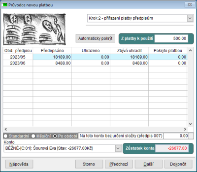 2. Obrázek: Průvodce novou platbou (Krok 2 - přiřazení platby předpisům)