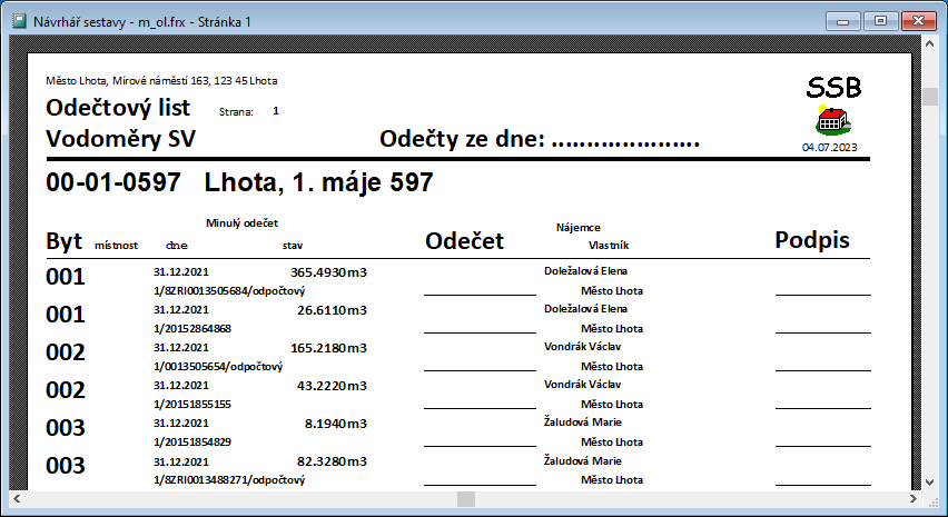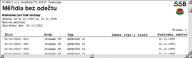 Obrázek: Příklad tiskové sestavy - Odečty měřidel souhrně