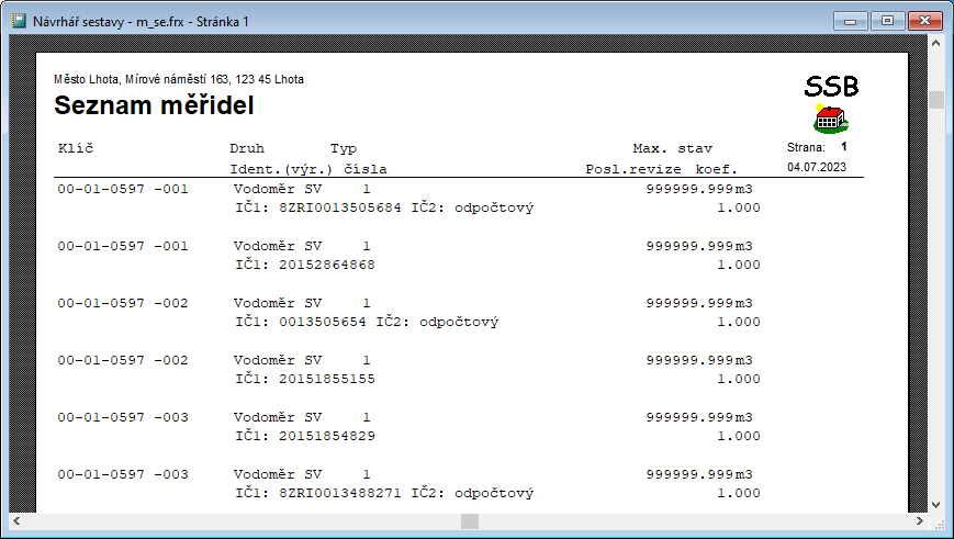 Úloha tiskne seznam měřidel dle evidence v Objekt - záložka Pasport včetně identifikace, umístění a posledního odečtu.