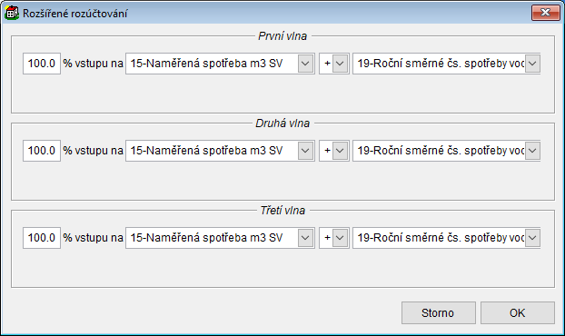 - Způsob rozúčtování - určuje, jak má být částka nákladu rozdělena mezi objekty. Je zde možno zadat rozúčtování 100% jen v jednom řádku, nebo rozúčtování základní a spotřební složky (jeden řádek a druhý řádek), např. 30% a 70%. V každém řádku dále následuje rozbalovací nabídka všech jednotek, definovaných v úloze Ukládané jednotky, rozbalovací nabídka matematických operátorů ( * | / | + | - ) a znovu rozbalovací nabídka všech jednotek.