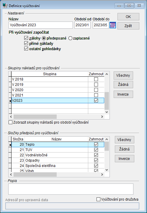 Dalším prvkem, který umožňuje flexibilní práci s vyúčtováním je možnost v jednom vyúčtování zpracovat pouze část celků. Jednoduše tedy lze vyúčtovat spravované celky města odděleně od celků společenství vlastníků.