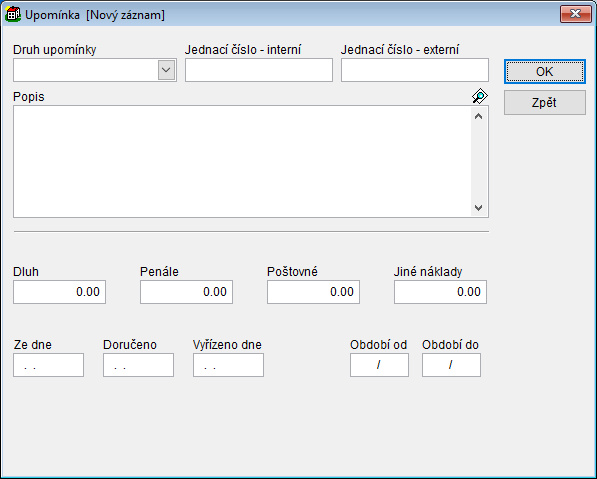 Po stisku tlačítka Přidat je možno přidávat nové záznamy