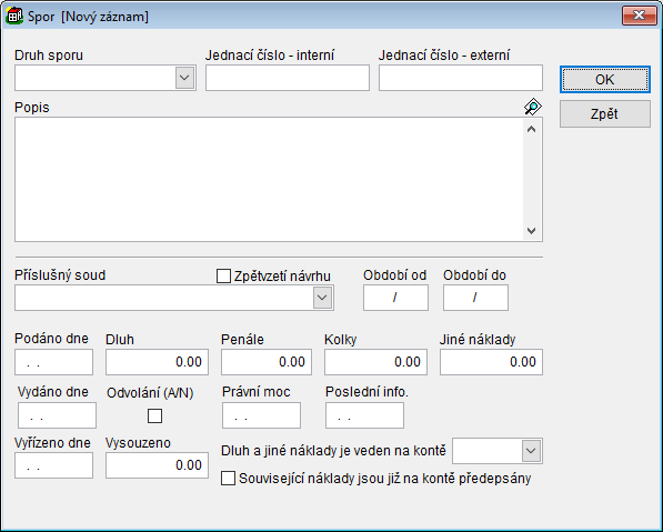 Ve většině případů se předpisy zapisují na Běžné konto. V případě, kdy podáte návrh na Platební rozkaz a nechcete na aktuální konto pořizovat další zápisy, vytvořte nové konto a nastavte ho u subjektu jako aktivní. Všechny následující předpisy budou předepisovány na toto nové konto. Je možný a pravděpodobně i vhodnější opačný postup: vytvořte konto DLUHX a na toto konto převeďte všechny předpisy, které již byly zažalovány v rámci tohoto soudního sporu. Zkrácená jména kont se nemohou shodovat, v jejich názvu však můžete uvést libovolný text.