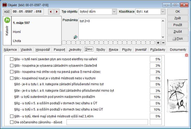 - Klasifikace - určení správné kategorie má zásadní vliv na výpočet nájmu (maximální či věcně usměrňované nájemné), pokud je v tomto objektu vyměřován. Nabídka je pevně definována.