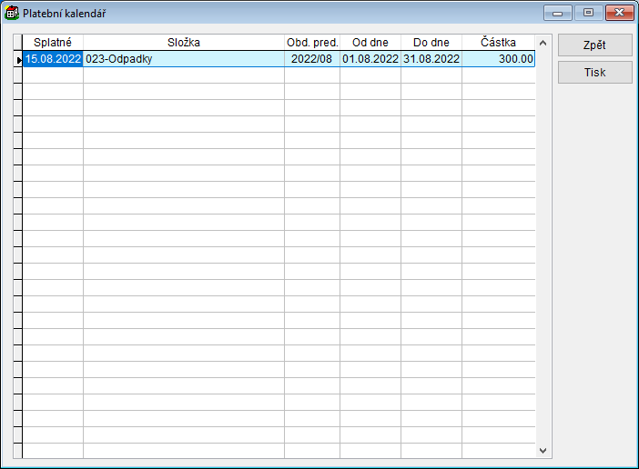 - Tlačítko Platební kalendář - je dostupné pouze pro složky, které mají nastaven způsob výpočtu na platební kalendář a zobrazí platební kalendář pro tuto složku, který umožní tisknout. Editaci platebního kalendáře umožňuje úloha Složky