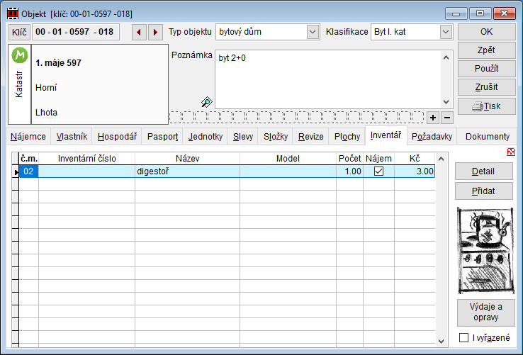 - Tabulka obsahuje seznam zařizovacích předmětů evidovaných v objektu. V seznamu je vidět, ve které místnosti se inventář nachází, jeho název, technické označení (model), počet kusů a zda toto vybavení zvyšuje nájem, nebo je pouze evidenčně zaznamenáno.