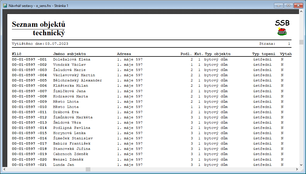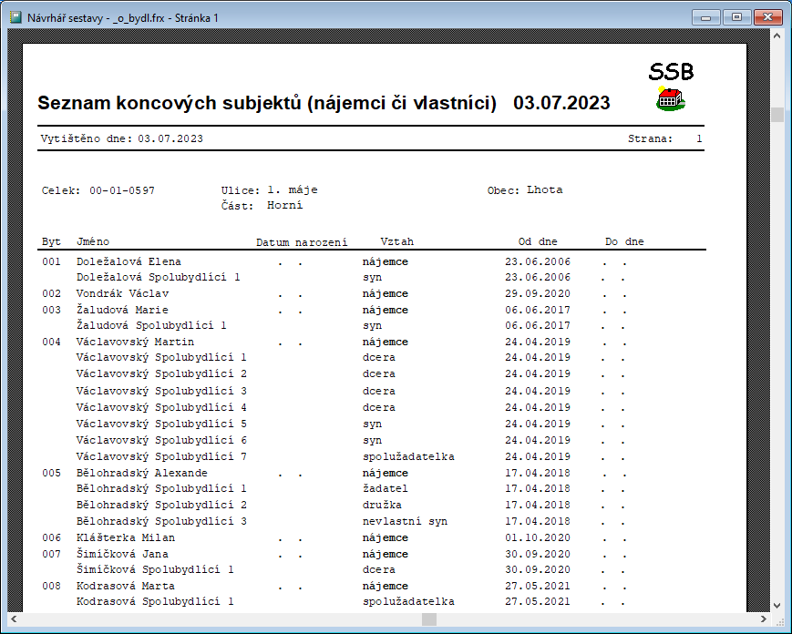 Tiskne seznam objektů včetně jména a typu nájemce (resp. vlastníka) který objekt užívá k datu „Dle stavu ke dni“. Lze vypsat též spolubydlící osoby.
