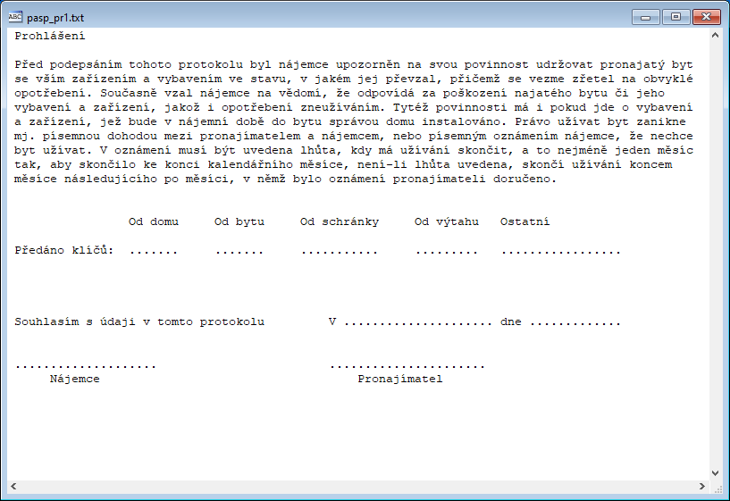 - Předvolba Prohlášení k převzetí - je-li zapnuta, do tisku je zařazen text „Prohlášení k převzetí“. Tento text je načítán ze souboru PASP_PR2.TXT v adresáři „MATRICE“ nastaveném v úloze Formulář Uživatelské nastavení - záložka Adresáře. Standardně obsahuje text potřebný pro převzetí bytu od nájemce po ukončení užívání. Není-li soubor v adresáři, prohlášení je prázdné.