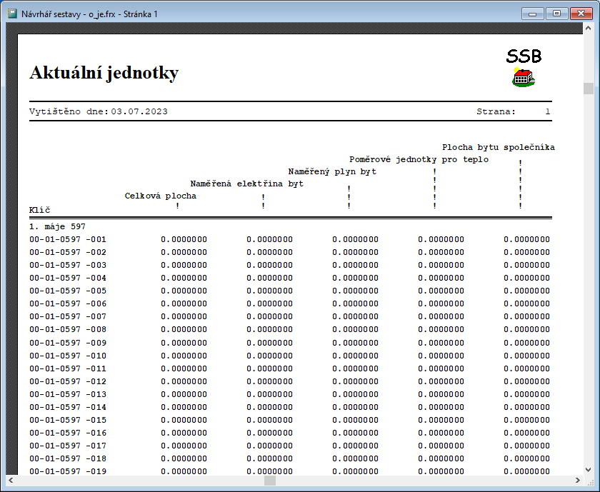 - Předvolba Evidované jednotky - je-li zapnuta, do tisku je zařazena tabulka „Výpis evidovaných jednotek“. Tabulka obsahuje seznam všech aktuálně nenulových hodnot jednotek definovaných v úloze Ukládané jednotky.